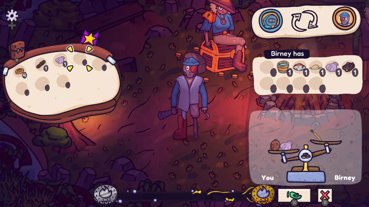 O ile gry cozy to niekoniecznie moja żyłka, tak z tymi “symulatorami negocjacji” kontakt już miałem. Dobrym przykładem będzie całkiem świeże w switchowym półświatku No Umbrellas Allowed - recenzja TUTAJ. Niestety, Fireside na tym polu mocno odstaje, a kolejne transakcje dokonujemy w barterze. I to zazwyczaj w sytuacjach, gdzie to klient wymaga i to on coś chce. My tylko musimy lawirować wg domniemanych wartości, jak mu to przekazać. On się cieszy, a Ty masz więcej fantów na kolejne wymiany. Chcę linę, to weź od niego kocyk. Inny będzie chciał kocyk, to zgarniesz dwa jabłka. Doszukiwanie się przesadnej głębi w tym systemie byłoby sporym błędem. Jej tu nikt nie oczekuje. W końcu cozy więc nikomu nie w smak kombinacje. Tu nawet niektóre zachcianki stoją dosłownie obok siebie. Dwie postaci - jeden chce przedmiot A, drugi B, na krzyż by byli zadowoleni z posiadania i aż chciałoby się krzyknąć, żeby wymienili się bez pośrednika.Nie jest jednak tak, że wszystko tu przechodzi. Jeśli będziesz chciał wziąc za dużo z kieszeni nowo poznanego przyjaciela, to ten, mimo swoich niespełnionych zachcianek, może zwyczajnie odmówić. Fireside nie daje się wzbogacić na pragnieniach innych! I tu objawia się, jak beznadziejnym jestem przypadkiem do takich gier. Ja już chciałem jakiś cel, szukałem w tym większego sensu, a miałem po prostu pomagać. To mój cel, to mój sens. Ktoś coś chce, Ty to masz, dogadajcie się.