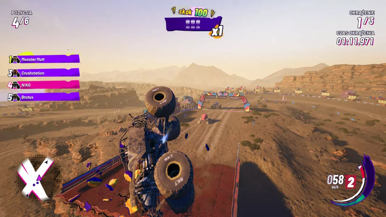I może na taki tryb “już z górki” przeszli deweloperzy po wylaniu tych fundamentów. Kiedy doszło do fizyki pojazdów, to coś ewidentnie poszło nie tak i ktoś przysnął na robocie. Niby Monster Truck, ale potrafi kręcić się powietrzu jak muszka owocówka przy najmniejszej kolizji. Czasami nawet nie wiesz, co spowodowało tego powietrznego bączka, którego właśnie doświadczasz. Czasami barierka, czasami kamień, ale ich absurd wykroczył poza akceptowalną skalę. Jeśli wkręciłeś się w te wyścigi ogromnych maszyn, to dość częste wypadki szybko sprowadzą Cię na ziemię.Na Switchu wszystko oglądamy zza gęstej mgły, a goniony kierowca z żółtą koszulką lidera przypomina rozmazane piksele. Mimo to, jak na warunki Switchowe (!), daleki byłem od narzekań. Akceptowalnie się to oglądało, a dość małe areny zmagań na pewno mocno przyczyniły się do tego, że konsola się nie zadławiła (to w końcu Unreal Engine 5).