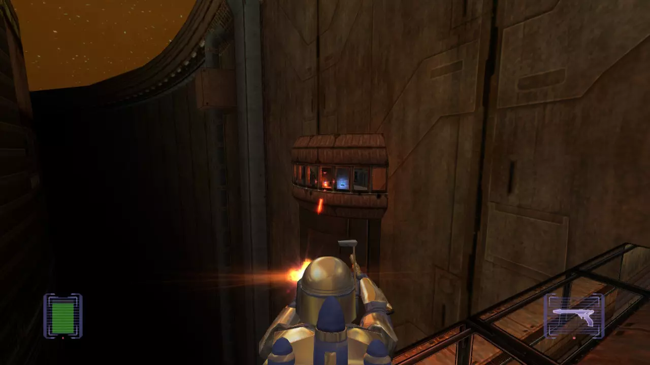 Skłamałbym, rozpływając się nad oryginalnym Bounty Hunterem. Łatwo wrócić do ocen z przeszłości i sprawdzić jego mieszane opinie. Jest to prosty konstrukcyjnie shooter z widokiem z trzeciej osoby (TPP), gdzie wasza sympatia do tamtejszych archaizmów może być niezbędna w czerpaniu przyjemności. Gra dzieli się na kilkanaście misji, gdzie, mimo sporej dozy liniowości, łatwo przegapić właściwą ścieżkę. Jango, jako profesjonalista, został uzbrojony w wiele przydatnych gadżetów, które oryginalni twórcy zamierzali podkreślać na absolutnie każdym kroku. Będziemy przecinać kraty (i czasem trudno je wypatrzyć), elektrycznym lassem łapać opcjonalnych przestępców, a przede wszystkim - latać jetpackiem.Wszystko to mogło robić wrażenie ponad 20-lat temu, ale dziś jest jedynie ciekawostką. Dodatkiem zepchniętym w naszych głowach na drugi plan. Jetpack mógłby nieco bardziej wpływać na wyobraźnię graczy, gdyby nie jego bardzo krótki bak. Paliwo kruszy się zdecydowanie za szybko, więc zanim się zdążymy nacieszyć, trzeba będzie lądować i czekać na kolejną szansę tego “przedłużonego skoku”.